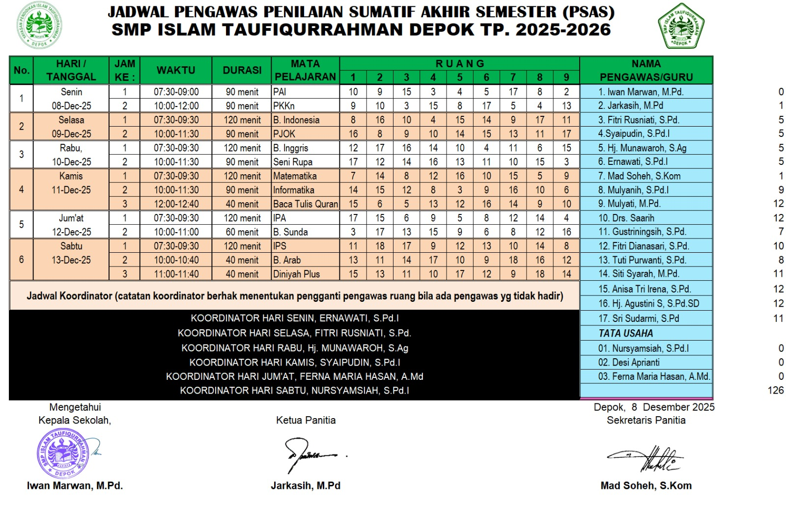 Adapun Jadwal pengawas PSAS di SMP Islam Taufiqurrahman sebagai berikut :