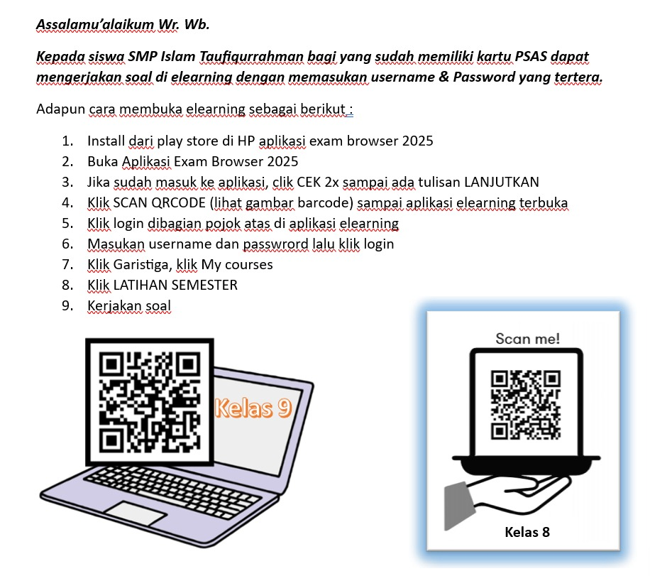 Kegiatan Penilaian Sumatif Akhir Semester (PSAS) di SMP Islam Taufiqurrahman Tahun Pelajaran 2025/2026 dilaksanakan pada tanggal 8-13 Desember 2025 dengan menggunakan 9 Ruang tes, 1 guru Pengawas, dan 1 ruang panitia. PSAS di SMP Islam Taufiqurrahman menggunakan elearning dimana siswa mengerjakan dari kelas secara online. Siswa dapat menggunakan paket data atau bisa juga menggunakan wifi yang ada di kelas masing-masing.